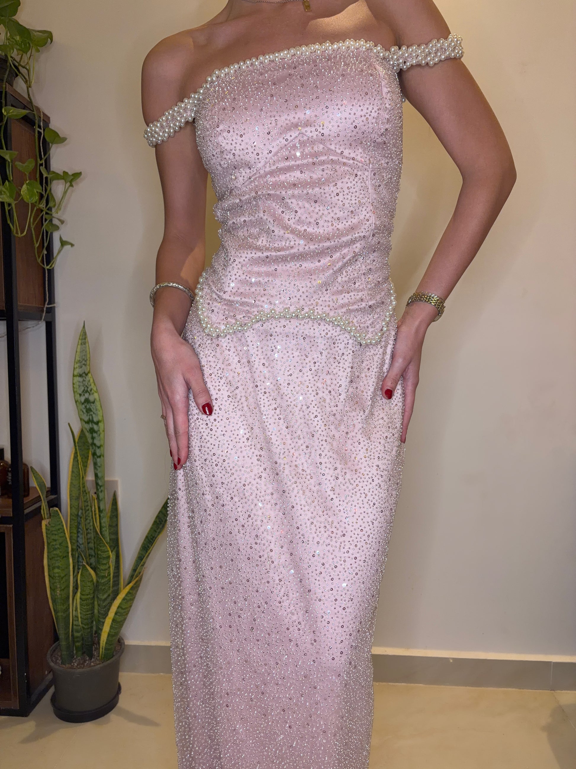 Command attention at your next formal event in this exquisite Blush Pink Two-Piece Evening Set. This glamorous ensemble features a shimmering, off-the-shoulder cropped top accented with delicate pearl trim, perfectly paired with a matching floor-length skirt. The true showstopper is the back, where the cropped top showcases a highly feminine and adjustable corset lace-up detail that ties elegantly down the back, offering a romantic and customized fit. Covered head-to-toe in subtle, dazzling micro-beads or sequins, this outfit promises radiant sparkle and a sophisticated, unforgettable silhouette.
