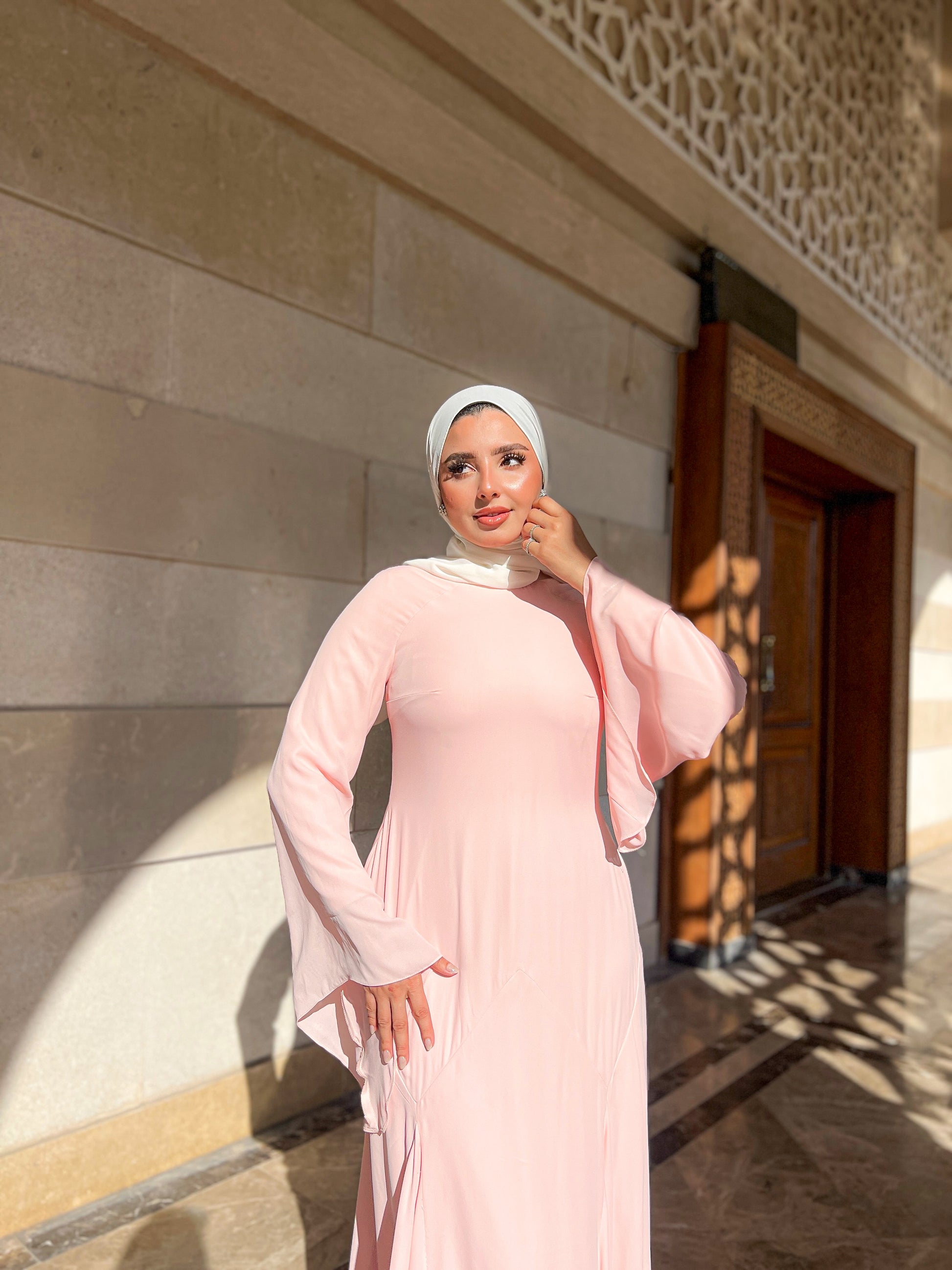 The dress embodies soft femininity and modest elegance. The blush color and simple body contrast perfectly with the dramatic, voluminous sleeves, creating a balanced and visually interesting ensemble.
