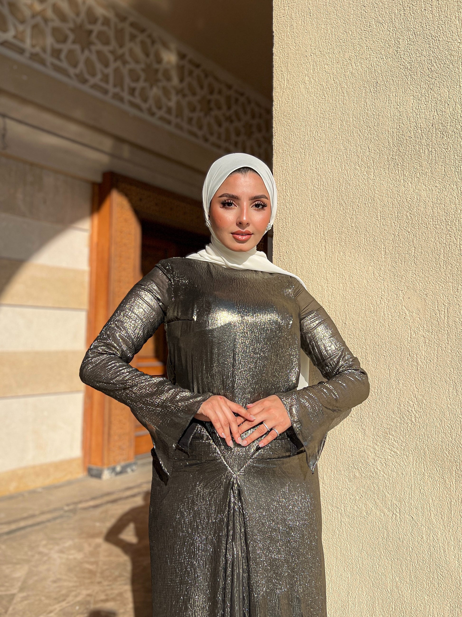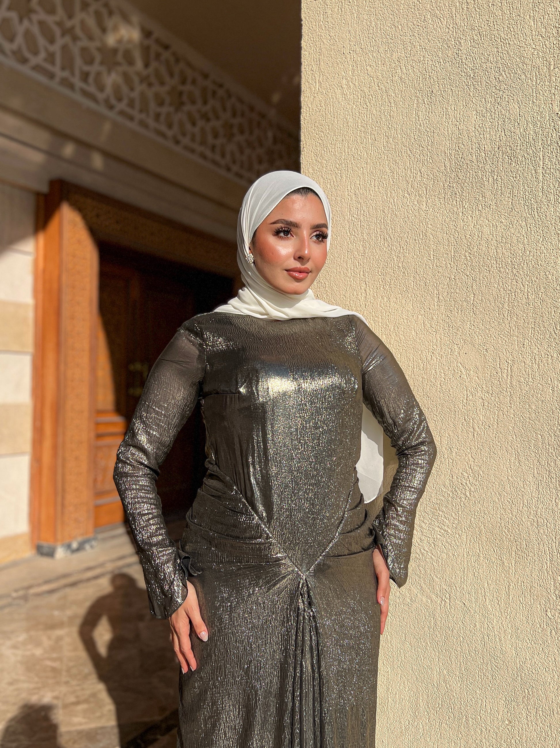 The dress blends modesty (long sleeves, high neck, full length) with undeniable glamour. The metallic color and structured draping give it a modern, confident, and very chic appeal, making it perfect for any event.