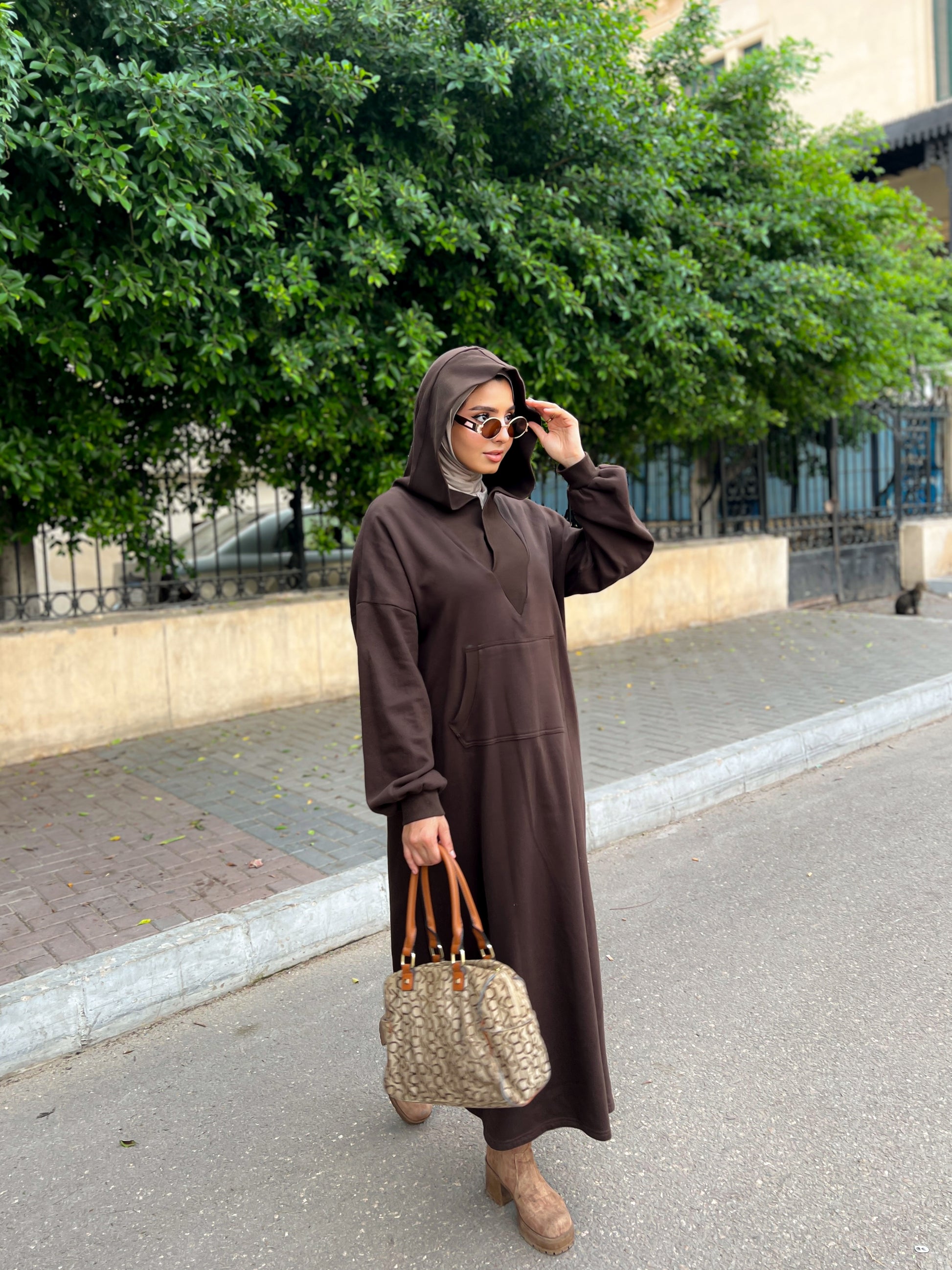 This is a maxi hoodie dress in a solid, rich dark brown color, offering a relaxed and casual style. The main garment is a full-length, oversized dress made from a comfortable, sweatshirt-like material, featuring the classic elements of a hoodie, including an attached hood and a front kangaroo pocket. Its very loose fit and long length provide a modest and comfortable silhouette.