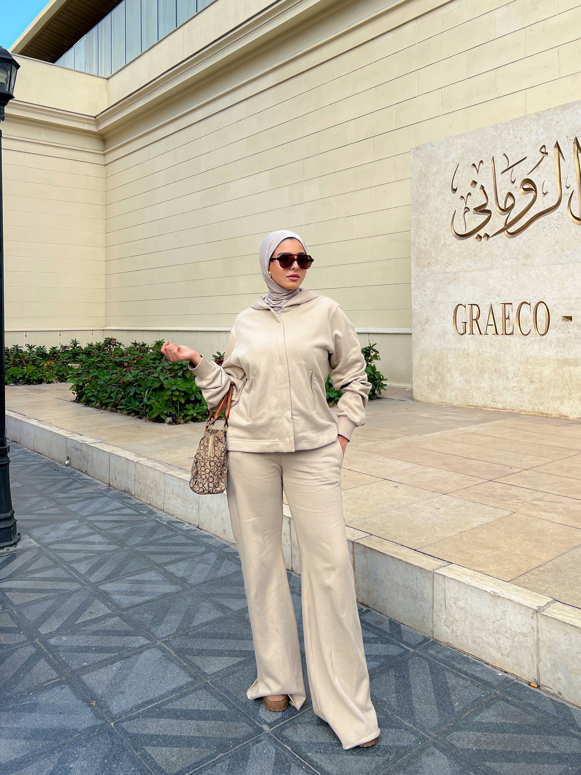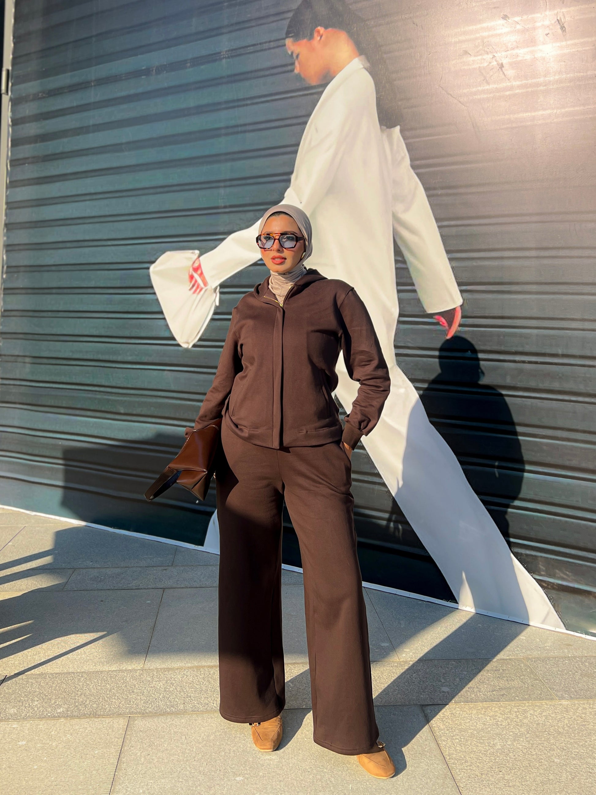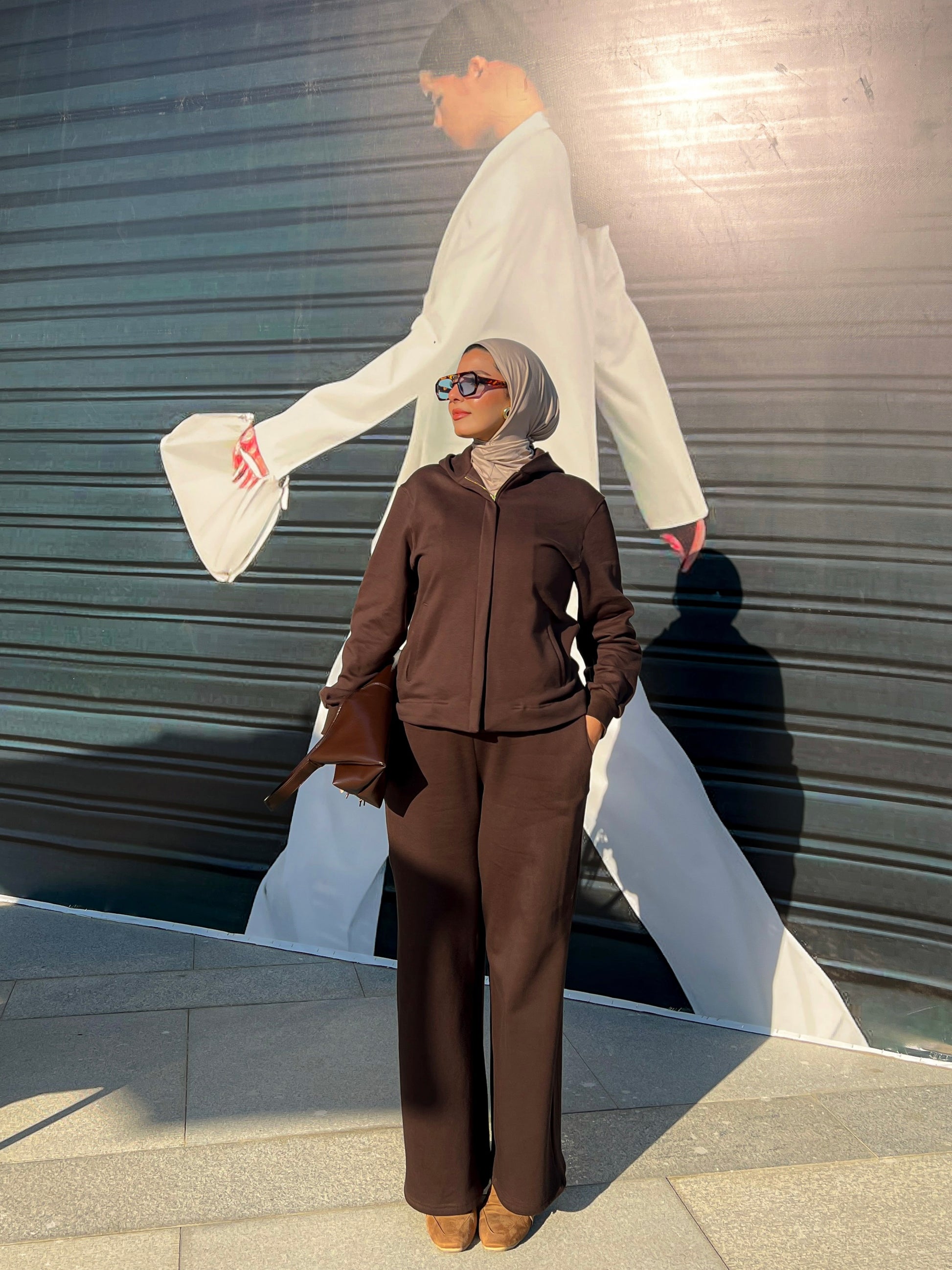 The pants are a pair of wide-leg in different colors. They are tailored with a relaxed, flowing silhouette, starting from the hip and draping straight down to the ankle. The fabric has a substantial, smooth texture, suggesting a comfortable yet structured material. The wide cut gives them a contemporary and modest feel, allowing for easy movement while maintaining an elegant, elongated line. They contribute significantly to the overall monochromatic and sophisticated aesthetic of the outfit.